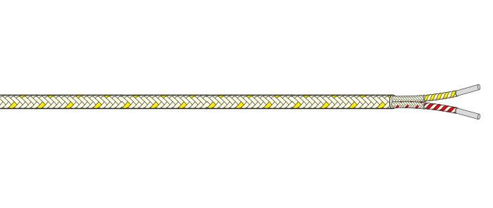 We supply 24 AWG thermocouple extension grade cable in 100, 200, 500, or 1000 ft lengths, available in Type KX, TX, JX, NX, or SX/RX, in accordance with ANSI MC96.1. Each conductor is insulated with fiberglass, laid in a parallel construction with an overall fiberglass jacket. Extension grade conductors are manufactured from extension alloys matched to their thermocouple type and are designed for accurate signal transmission between the sensor and the measuring instrument. All cables meet ANSI MC96.1 requirements for extension grade wire, with insulation color coding in accordance with ANSI MC96.1-1982, as shown below.